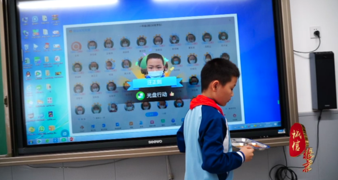 午餐时间,学生们在老师的引导下,依次排队取餐、适量打餐,就餐完争先恐后走到讲台上进行光盘打卡。