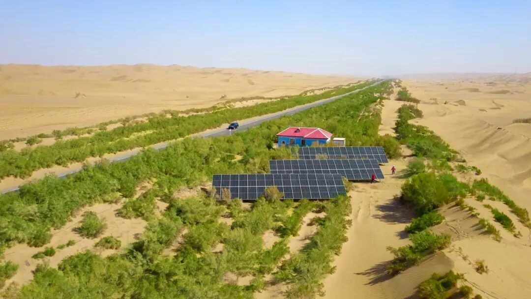 塔里木沙漠公路于1995年建成,全长566公里,是世界上贯穿流动性沙漠最长的等级公路。为抵御风沙侵袭,2006年,塔里木油田在公路沿线建成绵延436公里的生态防护林。2022年6月,塔里木油田沙漠公路零碳示范工程投产,实现生态防护林抽水灌溉“油改电”零碳排放,成为我国首条零碳沙漠公路。