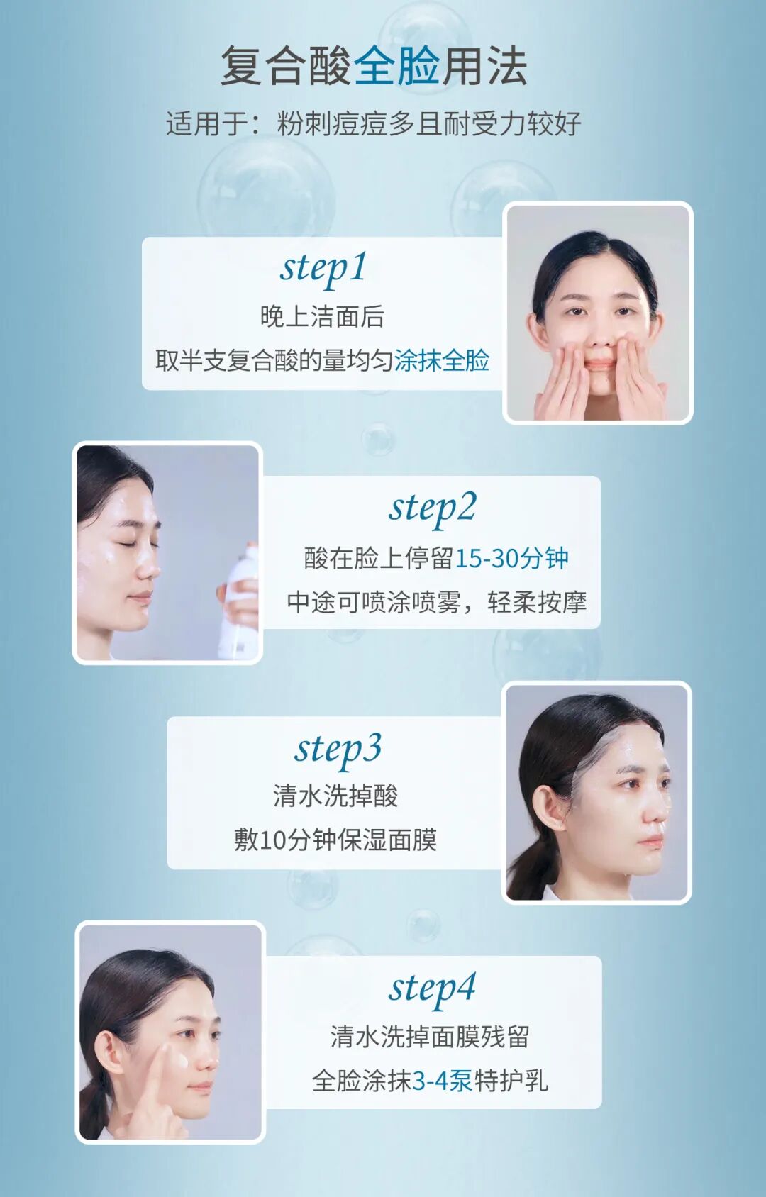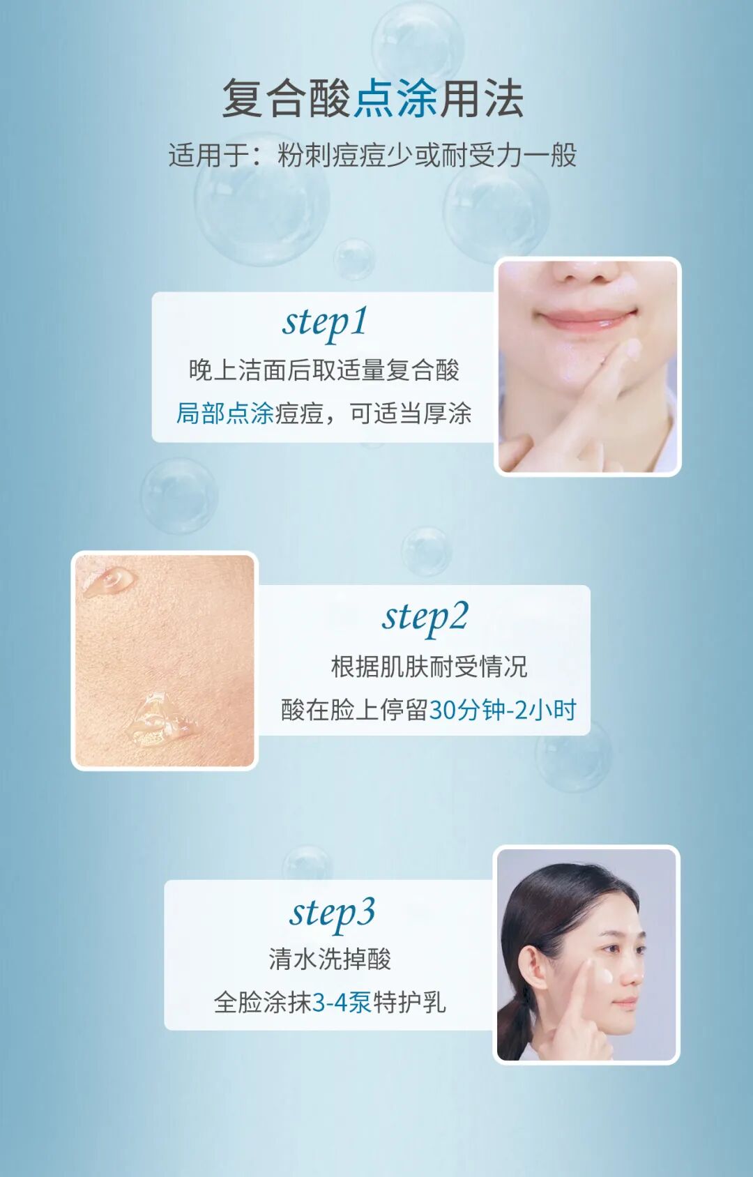 当然,每个人长痘情况有所不同,该怎么灵活使用复合酸呢?