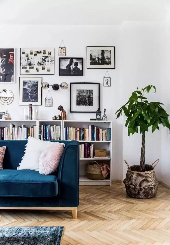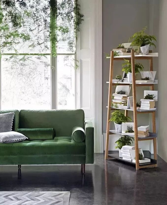 沙发边的凹墙可以放个多层置物架,比起矮柜可以收纳更多物品,还能搭起立体绿植角。
