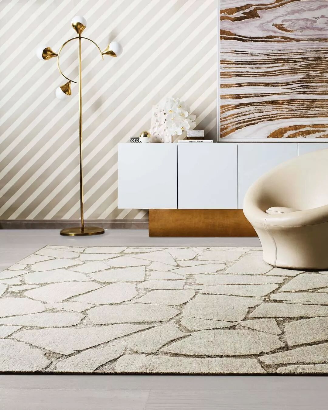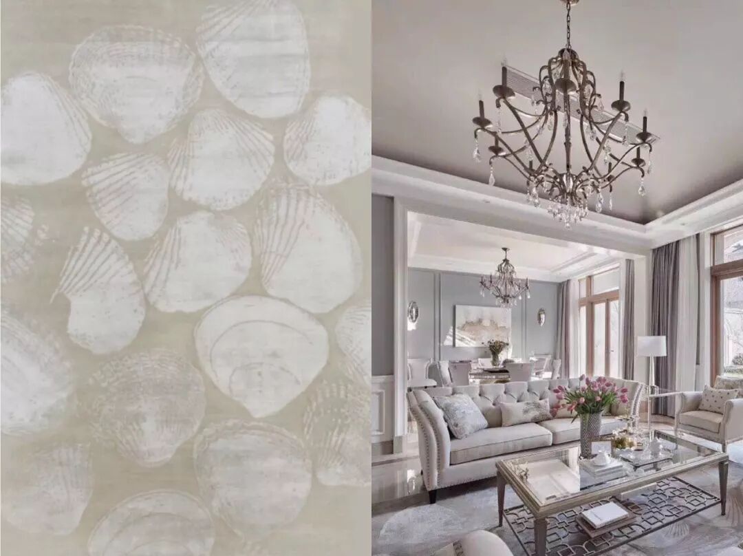 这款地毯贝壳白与浅紫色调调和出优雅得法式风情,地摊上随机散落的白色贝壳让人联想起清爽海风,米灰色如柔软的沙滩,带来柔软的触觉感受。
