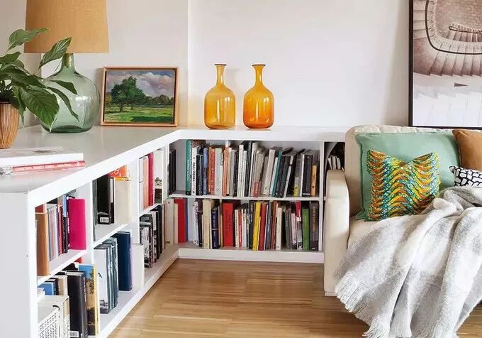 和玄关走廊交界处不用费力打造隔断,一排书柜自然而然区隔空间,也让客厅多了点书香味。