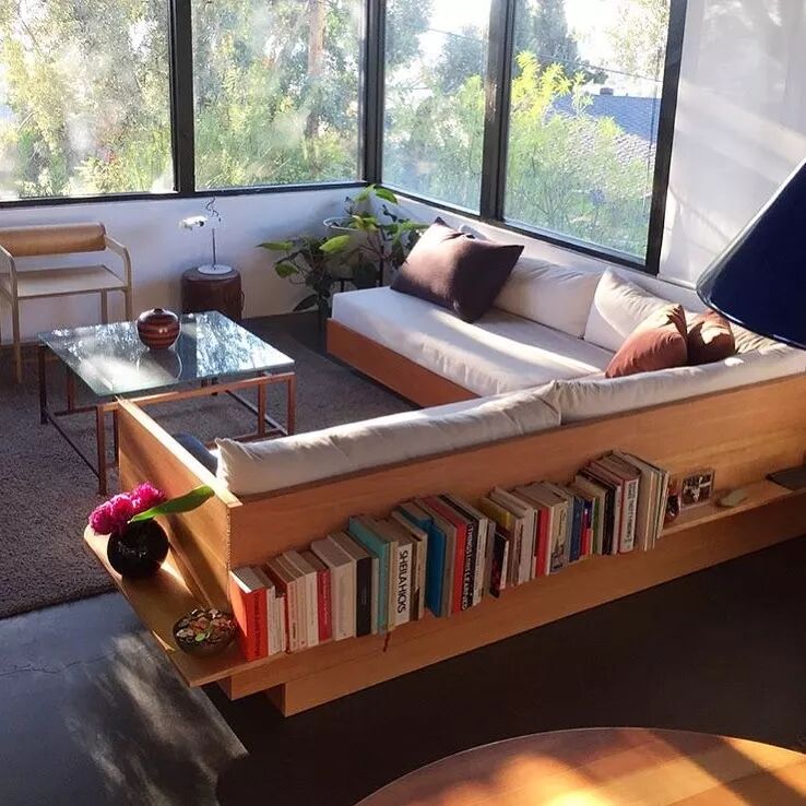 也可以把沙发前移,嵌入一个超薄的置物架,伸手可取,也是让家更便利的小细节。不想放弃茶几位,最好用精巧的“长腿”小茶几,代替笨重的四方茶几。