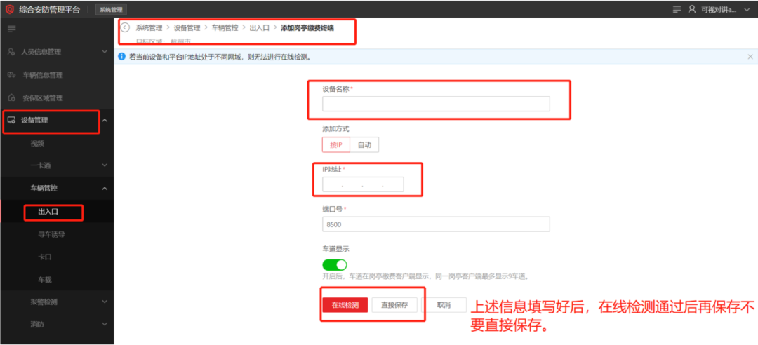 将安装好的岗亭客户端添加至平台,ip,端口8500(ip按照实际ip填写,分为按照IP添加和唯一码添加)