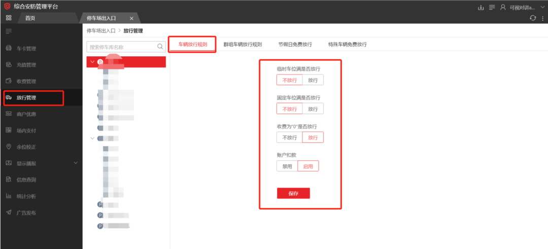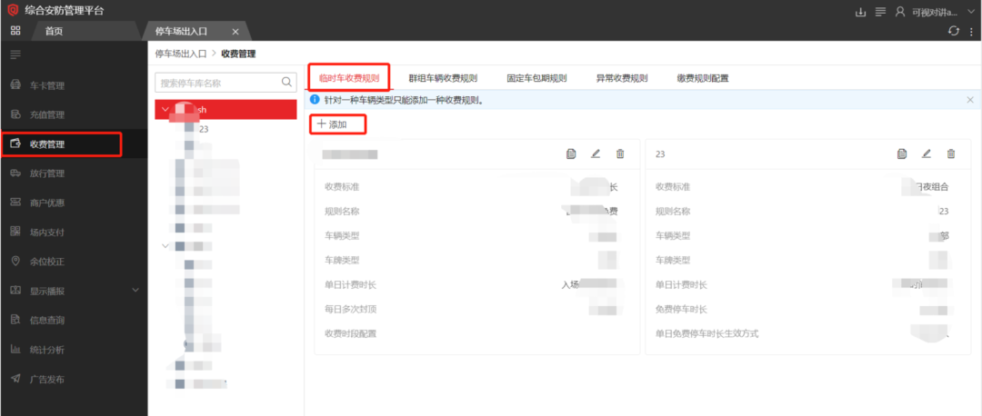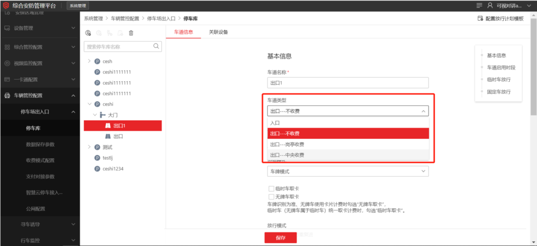 平台门户-车辆管控-停车场出入口-收费管理-配置好临时车收费规则、放行规则