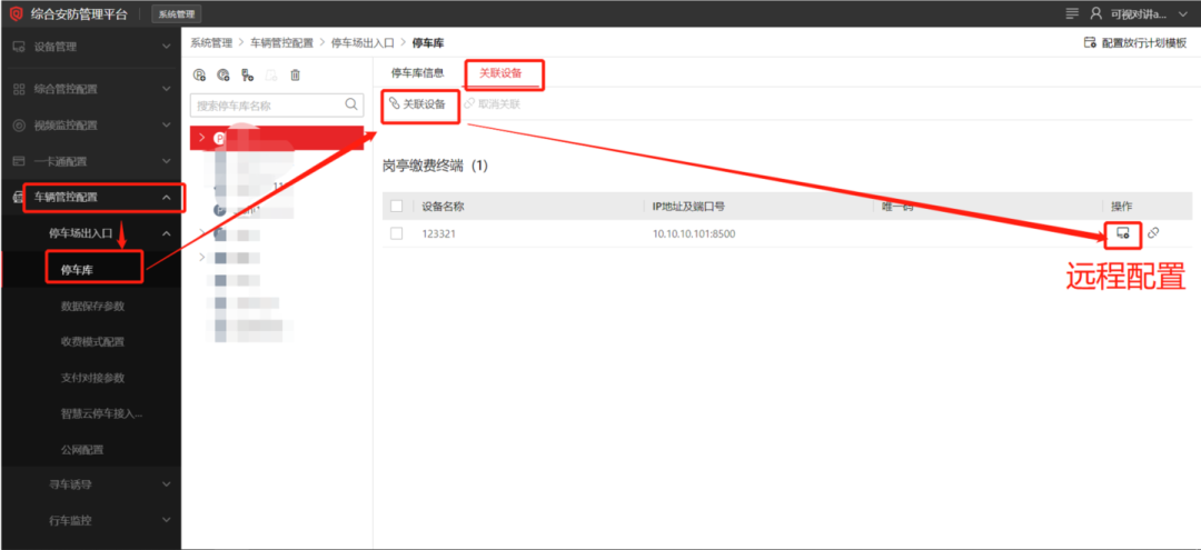 在车辆管控配置-停车库-选中对应的车库关联上一步添加的岗亭并进行远程配置