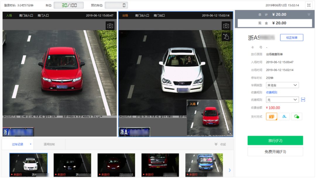 安保人员可手动控制临时车辆的出场并进行收费(已包期充值的固定车出场无需收费)