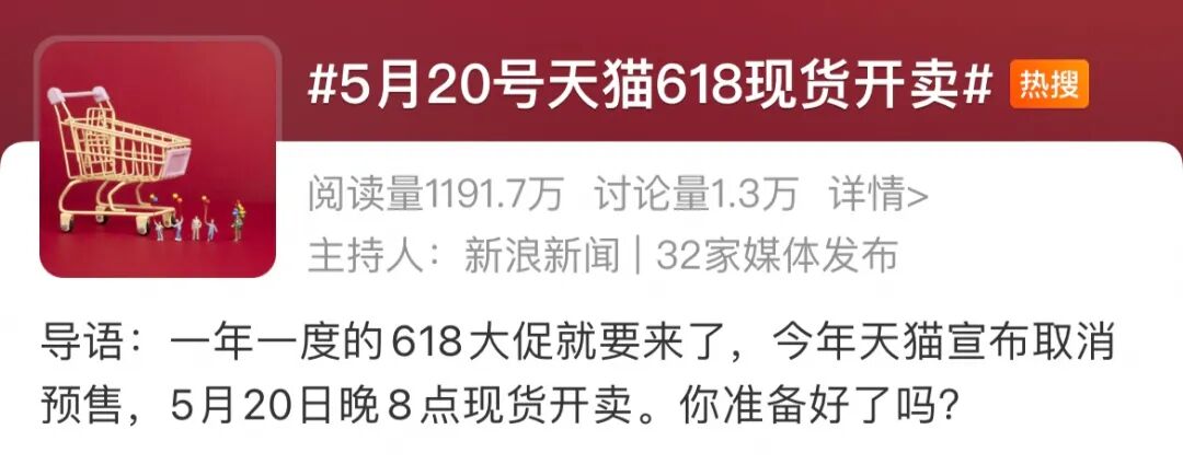 事情是这样的,5月20日晚8点天猫618现货开卖的消息,今天在网上不胫而走。于是,我联系了相关项目组里的同事,准备给各位家人深度解读一下本次天猫618的玩法。结果万万没想到,本次天猫618因为玩法过于简单,所以不具备深度解读的条件……但,会约了,人见了,拉通对齐了,这个稿显然是鸽不了了。家人们可以从5月20日晚8点起,至5月28日8点止,购买第一波618现货;第二波现货从5月31日晚8点起,至6月20日晚8点止。然后,是今天在网上议论最多的五折会场回归。包括不限于:华为、美的、耐克、lululemon、优衣库、alexanderwang、兰蔻、赫莲娜等品牌。由于网友们对五折会场的讨论过于集中,导致相当一部分家人形成了“天猫618,打五折”的刻板印象。所以,我在这里辟个谣,打五折是没错,但不是只打五折。届时,淘宝百亿补贴将大量加码“好货低价”的补贴,推出200款低至二折的大牌“全家桶”。在全网范围内,挑战价格底线。同时,美妆、3C、服饰等品类券通通加码,额度更高,券量更多,还可叠加平台官方立减85折,或跨店满减每300减50活动,以及88VIP大额券使用。别看我上面那段写那么多字,但操作只需要勾选就行,我写那么多字纯粹是为了水文章、凑字数。对了,今年的88VIP大额券将在今晚,也就是5月16日晚8点发放。淘宝APP搜索“88VIP”进入会员中心,使用188积分即可兑换。88VIP大额券,可以在5月20日晚8点后,即618活动期间,叠加平台活动使用。考虑到有相当一部分朋友,天猫618的购物车装的未必是自己的东西,特别是在520这样的日子里。所以,我们另一波看热闹不嫌事儿大的同事,在520当天为有送礼,特别是送礼表白需求的家人们整了一个“淘宝520好物清单”:最后,祝各位天猫618能用最低的价格买到想要的商品,在520也能收获期待已久的爱情。
