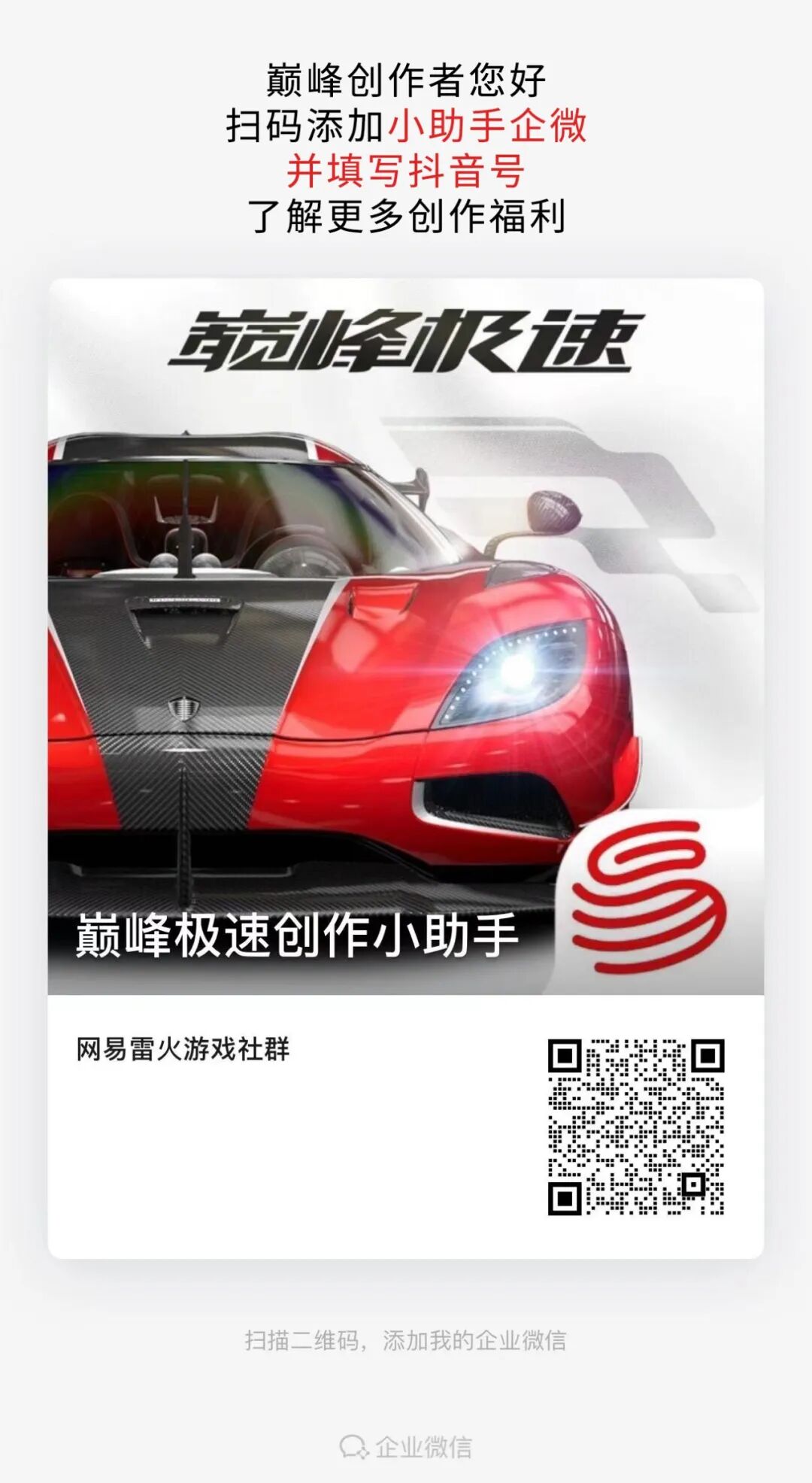 在抖音发布过巅峰极速相关内容,都有机会加入创作团!扫描下方二维码添加创作者小助手,填写抖音号验证身份即可加入创作团。