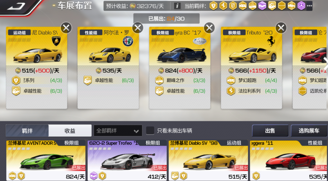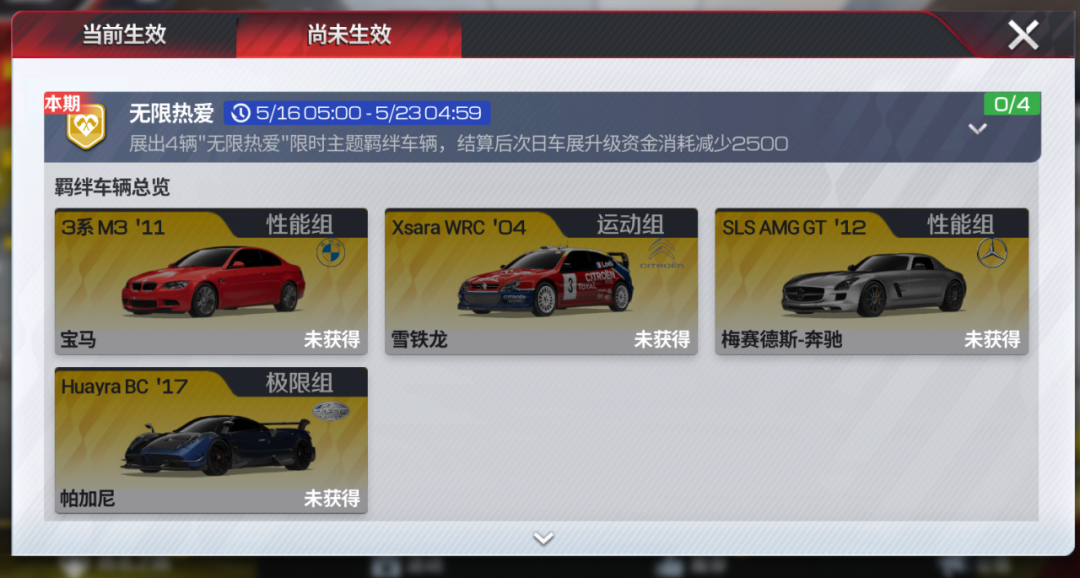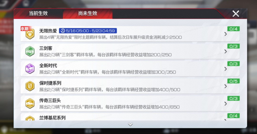 除了固定的金色羁绊外,每一轮还会有特殊的限定金色羁绊,每周刷新;本期的限定羁绊是“无限热爱”,只要展出四辆主题羁绊车辆,次日车展升级资金就可以减少2500,扩大你的车展规模,扶摇直上!本轮的限时羁绊还新增了有效时间提醒,时间就是金钱!