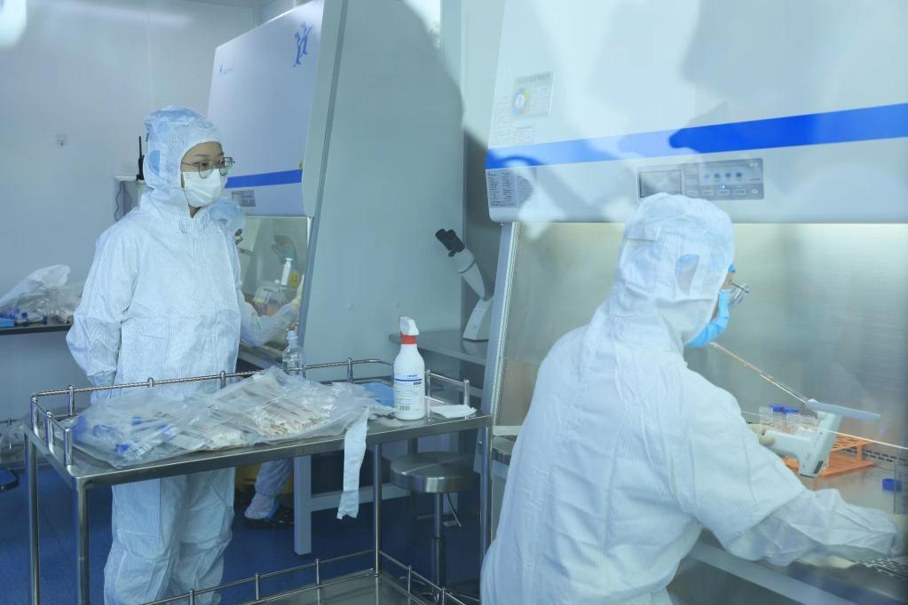 成都高新区前沿医学中心的四川省细胞库,研究人员在仪器设备前忙碌。新华社记者 董小红 摄