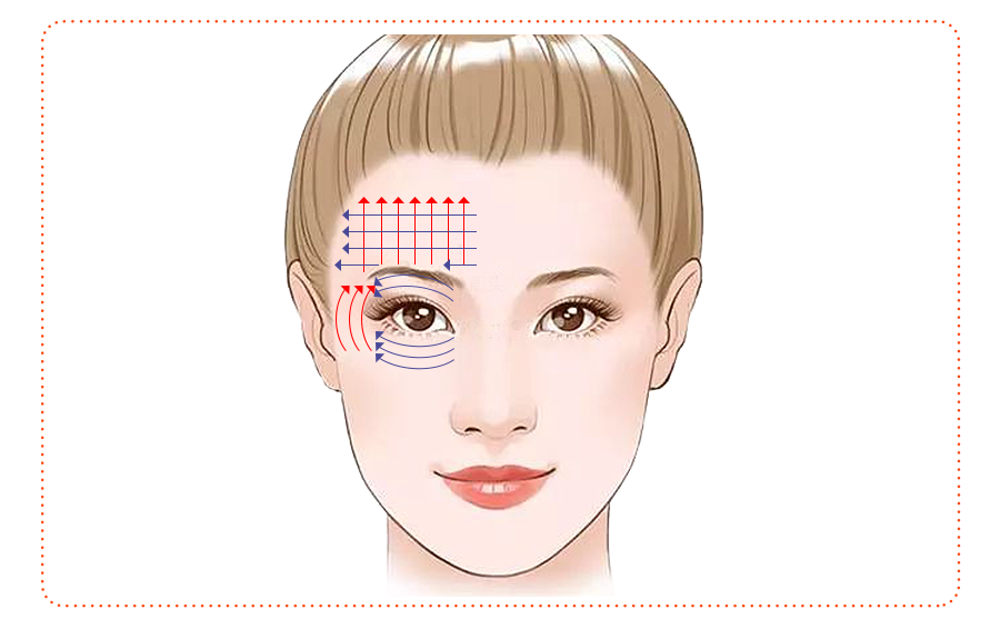 治疗眼周区域尤其眼上方部位,建议从中线向外侧发际线垂直向上开始,之后沿从中线到侧缘的方向水平治疗眼睛上方区域,从靠近眼睛的地方开始[2]