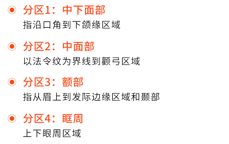 综合Dr. Isaac Wong和王展医生在临床实践的经验,建议在使用TempSure Envi丽可秀进行全面部抗衰治疗时,可以将面部分为4个分区: