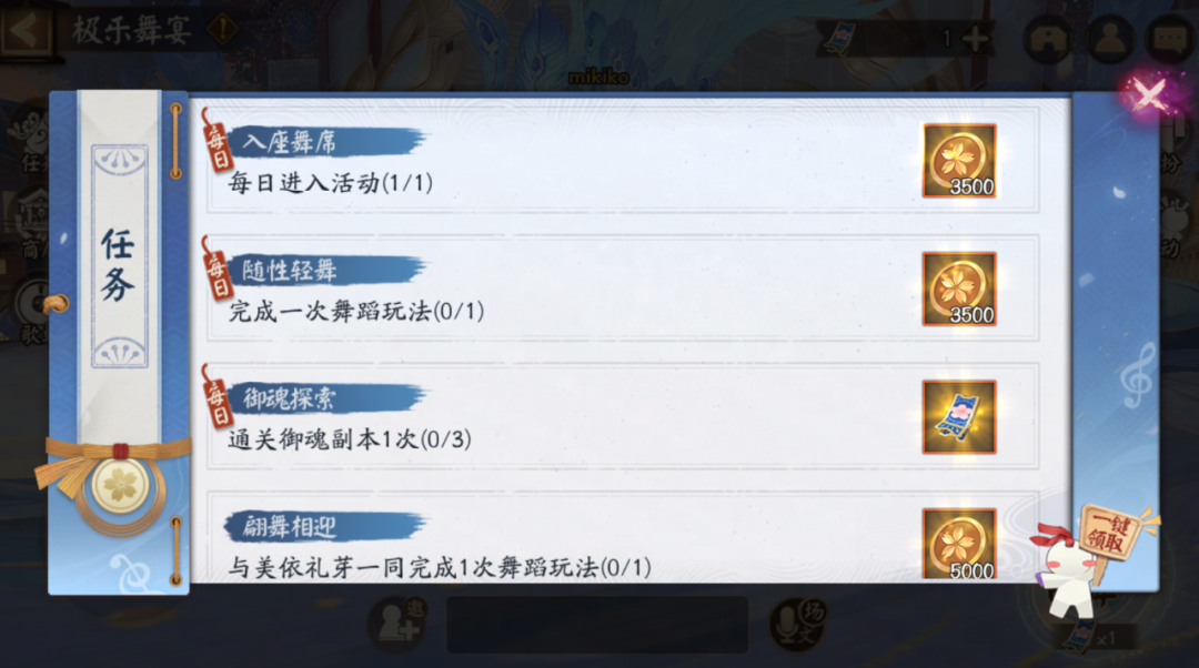 通过参与玩法完成任务即可获得舞宴金币