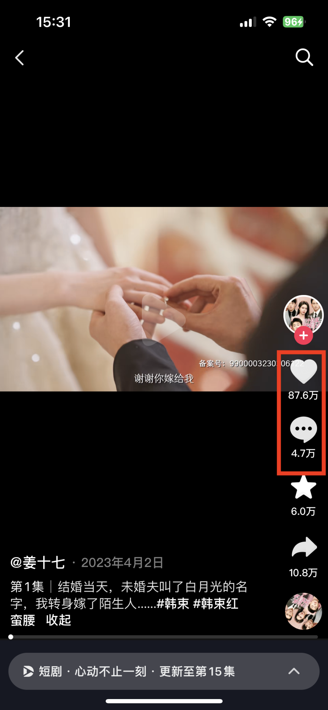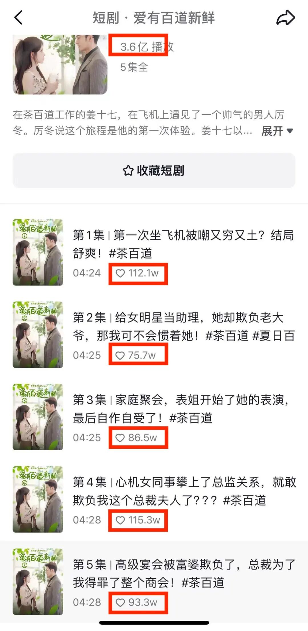 短剧因为其短平快的制作特点,在抖、快平台上出现了很多品牌定制的剧集,这显然是传统影视剧所没有的。有的“定制”甚至从剧名就能看出来,比如抖音平台上播放的茶百道定制短剧《爱有百道新鲜》,韩束的《一束阳光一束爱》等等。《爱有百道新鲜》的剧情故事也围绕在茶百道工作的女主@姜十七身上展开,这部仅五集的短剧收获了3.6亿+播放量和480万+的点赞量。