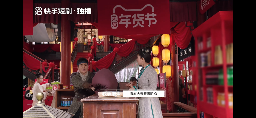 天猫年货节在快手冠名的另一档短剧《我在大宋开酒吧》更是邀请到了《甄嬛传》的“温太医”和“沈眉庄”时隔十年“重组CP”。剧中出现了一段“沈眉庄”在古代开“超市”的情节,超市中挂着天猫年货节的横幅,“满减”“包邮”“信鸽客服”等在天猫网购中常见的服务场景则在剧中多次出现,推动着剧情发展。