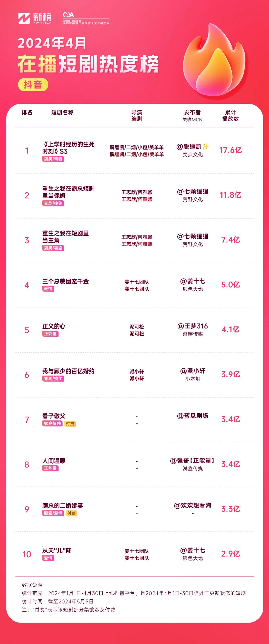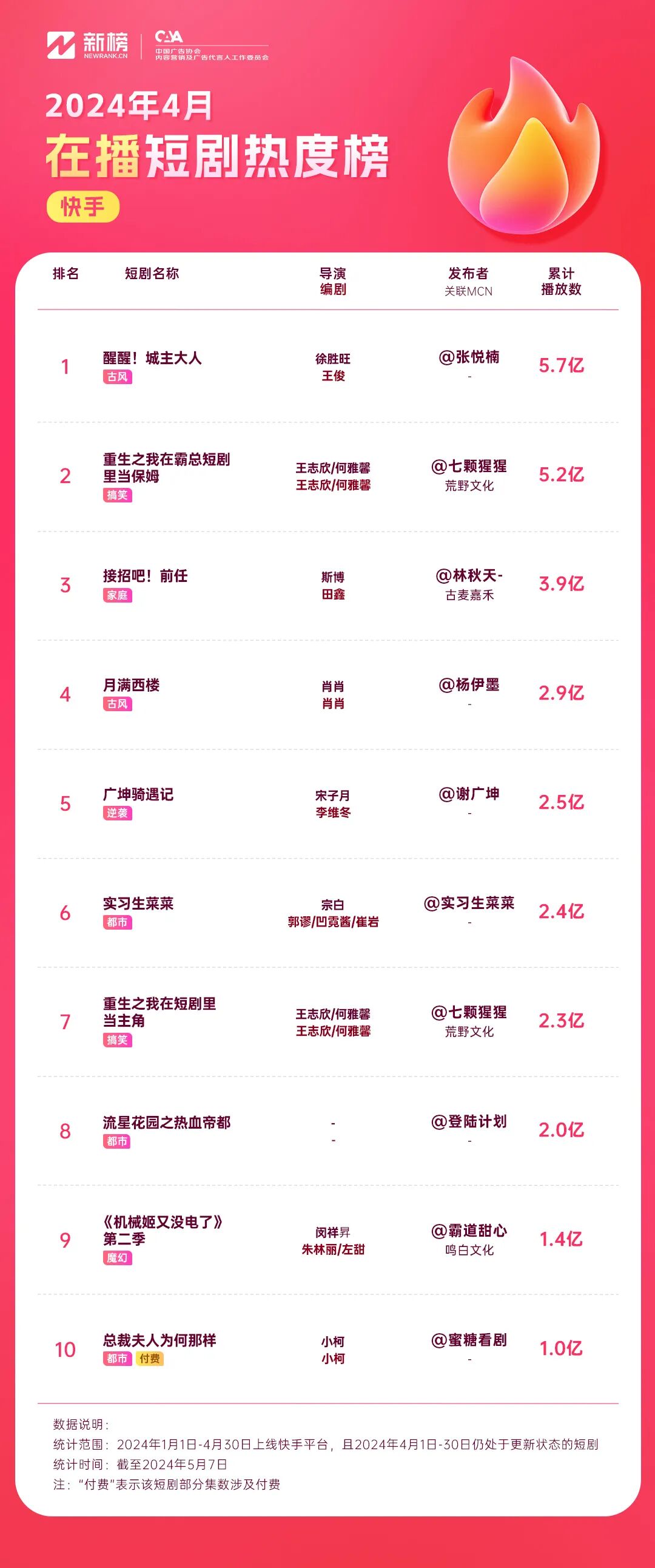4月30日,“微短剧里看中国”中央广播电视总台微短剧生态合作计划发布。随着“国家队”的下场,可以预见,在国家有关部委、地方政府、播出平台、制作机构、产业基金在内的多方力量共同参与下,短剧势必会成为政府、企业、品牌与用户之间的重要沟通媒介。我们也期待这份榜单能够为短剧行业的参与者提供有价值的参考,共同推动短剧行业在新时代背景下实现持续、健康、高质量的发展。更多短剧行业榜单、短剧现象解读,欢迎关注“新榜”公众号。![]()
