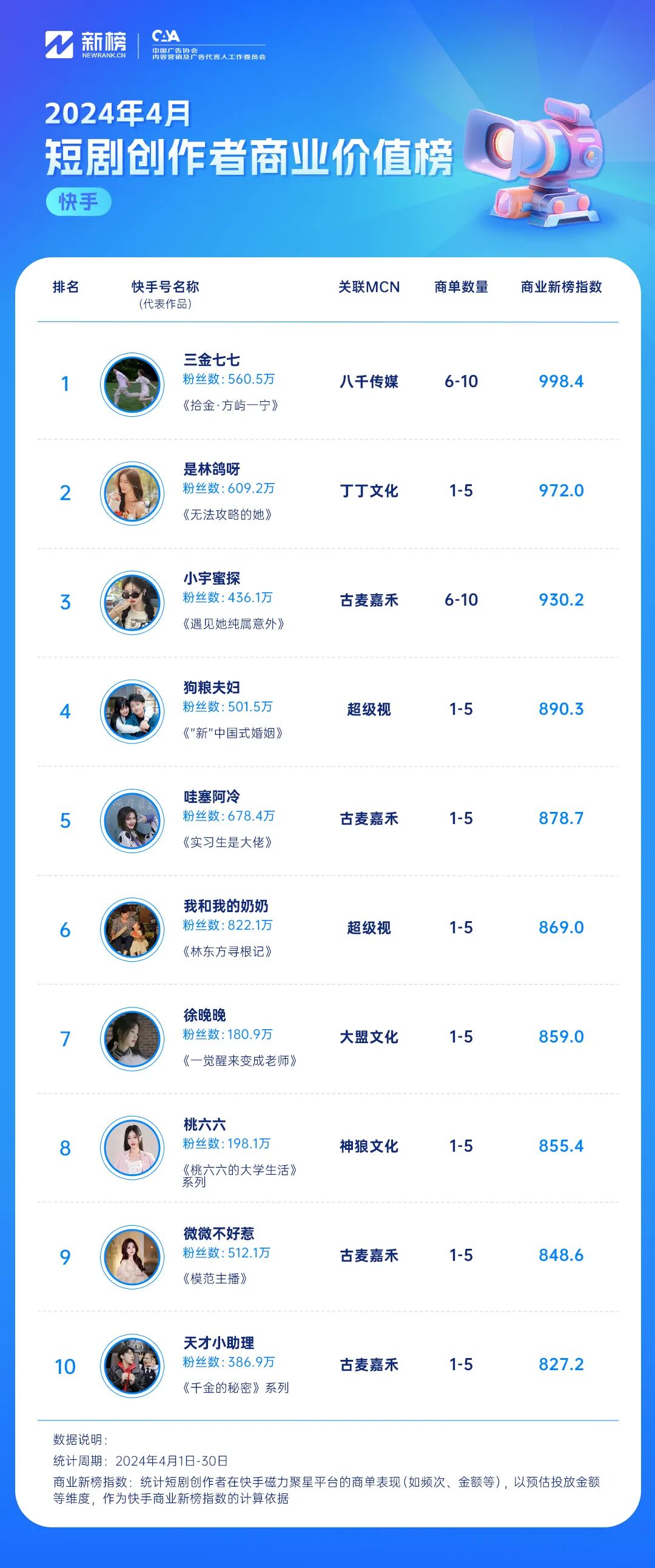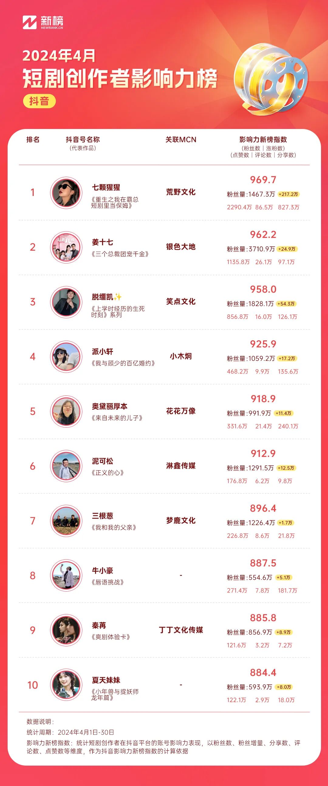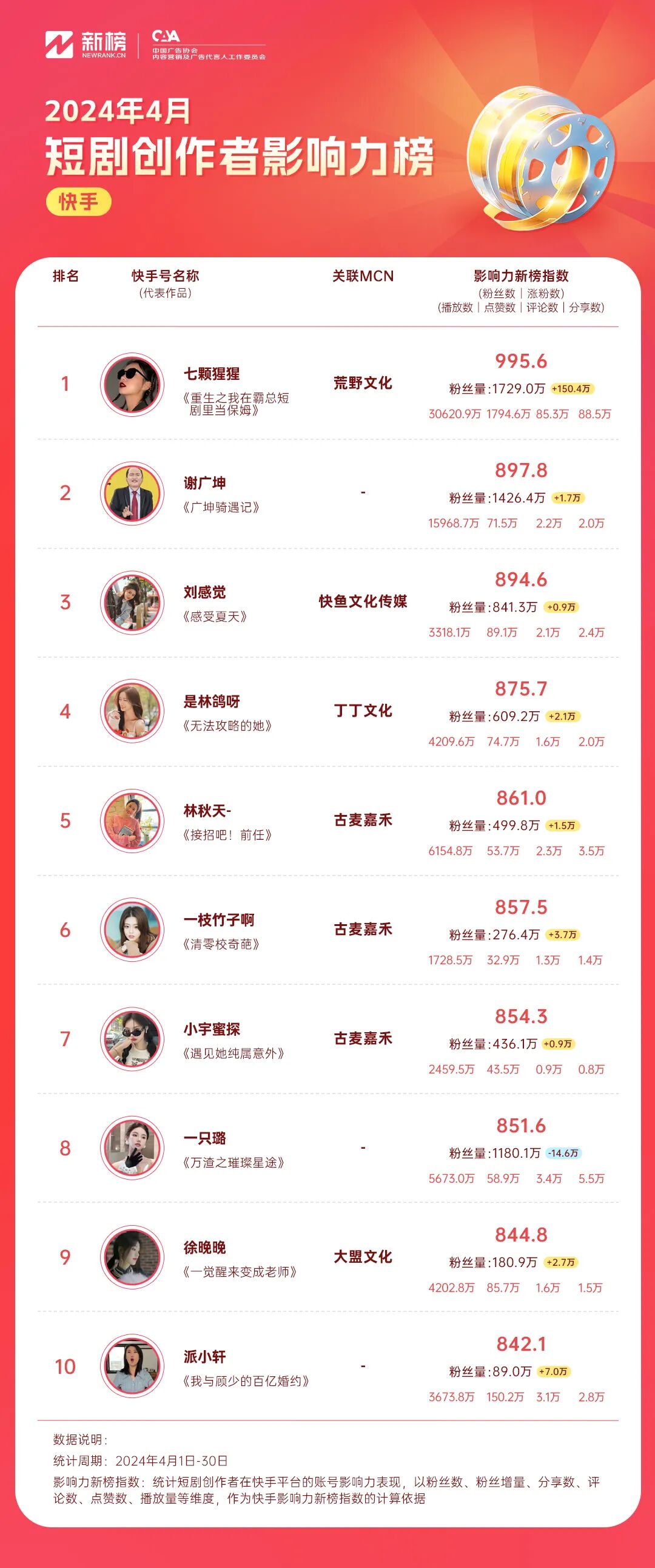 “七颗猩猩”4月内容延续重生这一主线,围绕反套路人设,借“王妈”之口对剧情、角色犀利吐槽,内容广受欢迎,继3月涨粉近190万后,4月涨粉超200万。同时,我们也留意到,4月内容中“七颗猩猩”也曾与“孙樾”、“小许👑”、“康雅雅”多位达人联动,参与短剧中角色客串。“姜十七”持续高产,排名上升一名,位列第二。据新榜数据,创作者4月内容发布量环比增长30%,发布三部全新短剧《三个总裁团宠千金》、《前任请开始你的表演》、《从天“儿”降》,其中《三个总裁团宠千金》抖音播放量最高,截至目前,累计播放量超5.3亿次。剧情围绕不知身份的豪门千金做销售被欺凌,后被三位霸总寻回并加以宠爱的故事展开,剧中的逆袭、霸总甜宠行为深得女频用户期许,获得了较好的传播效果。“脱缰凯✨”持续围绕《上学时经历的生死时刻》产出校园题材内容,“脱缰凯✨”4月内容发布数量仅为3月的73%,排名第三。4月,抖音商业价值最高创作者为“姜十七”。继《重启我的人生》、《翻山越岭来爱你》后,“姜十七”与百雀羚再度达成合作,推出短剧《三个总裁团宠千金》,剧中多次露出百雀羚产品,进行产品口播并在评论区置顶“安利”。在此之外,4月“姜十七”还与贝德美、英氏、欧诗漫等品牌合作产出多部短剧内容。银色大地、麦芽传媒商业价值突出创作者数量较多,上榜的创作者数量分别为3位与2位。在抖音平台在播短剧热度榜中,搞笑/喜剧、爱情类短剧上榜较多。同时,从发布者/关联MCN机构观察,包括“七颗猩猩”、“姜十七”、“脱缰凯✨”等多位高影响力创作者上榜。播放量最高剧集为《上学时经历的生死时刻》S3,作品至今已更新33集,总播放量超17.6亿次,从目前数据表现看,有望成为“脱缰凯✨”播放量最高的短剧。“七颗猩猩”、“谢广坤”、“刘感觉”为高影响力创作者“七颗猩猩”凭借着出色的角色表现以及适时出现的“嘴替”行为,备受欢迎,账号月播放量超3亿次,影响力断层式领先,账号月涨粉达150万。知名演员唐鉴军饰演的角色账号“谢广坤”,凭借快手与霍尔果斯野石榴影业联合出品的短剧《广坤骑遇记》上榜。短剧讲述了闪送员“谢广坤”阴差阳错假扮幕后BOSS,帮助企业老板“牛能”与投资人会面的故事。身份错位所带来的反差感,让这部短剧笑点频出。依靠“谢广坤”这一深入人心的角色形象与广泛群众基础,内容获得较好传播,账号内容总播放量超1.5亿次。快手创作者“刘感觉”4月作品中,校园霸凌、女性独立类选题获得了较好的传播,账号累计获赞量近90万次,影响力在快手榜单中位列第三。快手短剧创作者商业价值中,“三金七七”为第一。4月,创作者与美妆品牌“谷雨”合作了品牌短剧《拾金·方屿一宁》。品牌名称、产品在短剧封面、内容中多次露出,其中,有部分剧集采用了联合发布形式并对产品卖点进行了口播,商业曝光成效显著。从上榜的商业机构来看,古麦嘉禾为高商业价值创作者数量较多机构,包括“小宇蜜探”、“哇塞阿冷”在内共4位创作者上榜。![]()