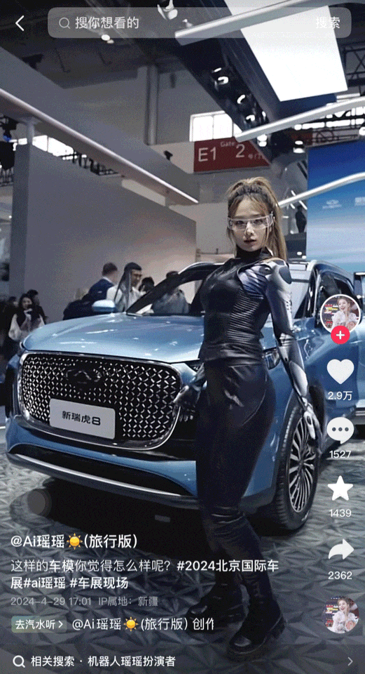 此前,在北京车展上的“AI瑶瑶”也因为动作酷似AI,硬控了现场观众30秒。但实际上她只是一位名为“Ai瑶瑶”的真人网红。