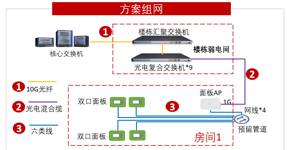 在万兆光纤进楼栋、万兆光纤进楼层的基础上,华为高品质万兆以太全光宿舍网络解决方案还创新地使用了光电混合缆,来实现接入交换机与末端面板式AP的联接,做到了千兆光纤进房间。