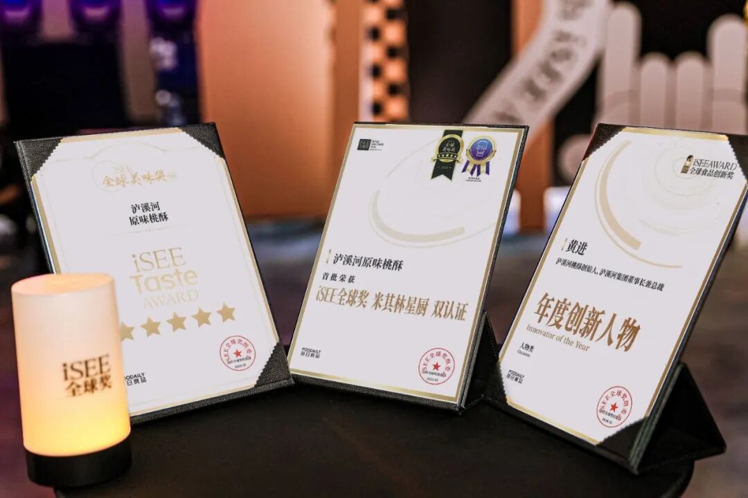 泸溪河作为新中式糕点品牌,受邀参与此次盛典,在全球4000多+案例中脱颖而出,斩获三项大奖:《ISEE全球奖米其林星厨双认证》以及《ISEE全球美味5星奖项》,泸溪河创始人黄进被评为“年度创新人物”。