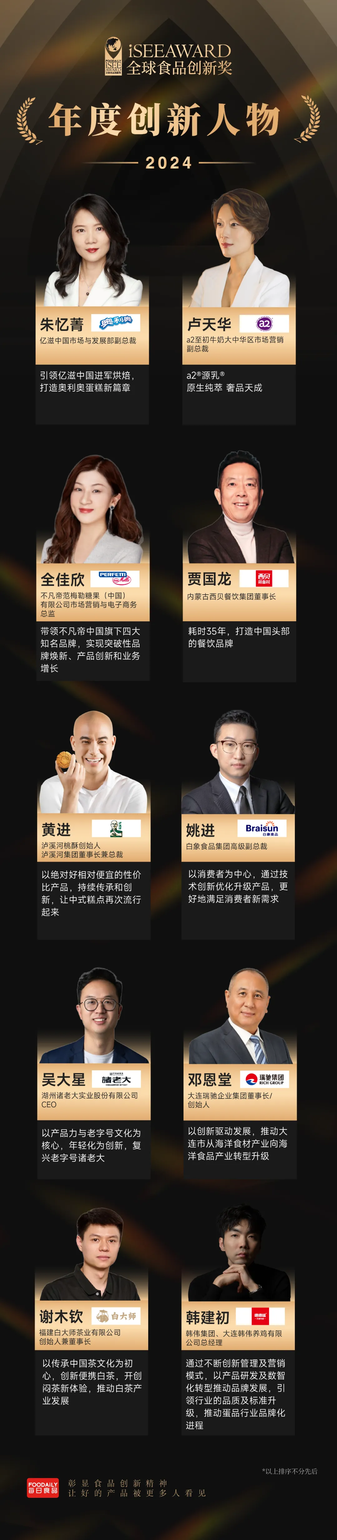 本次ISEE创新盛典还评选了【年度创新人物】,该人物榜单旨在挖掘并表彰食品饮料行业中品牌、品类的开创者,新技术拓荒人,以及新模式的商业领袖。每年仅评选10席。