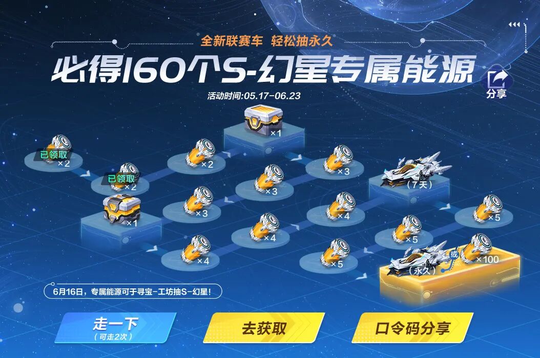 这次的免费提车活动时间有限,车手们参与活动必得180个S-幻星专属能源或永久A车S-幻星其一,人人有份,绝不落空!