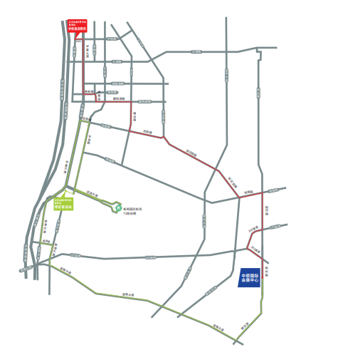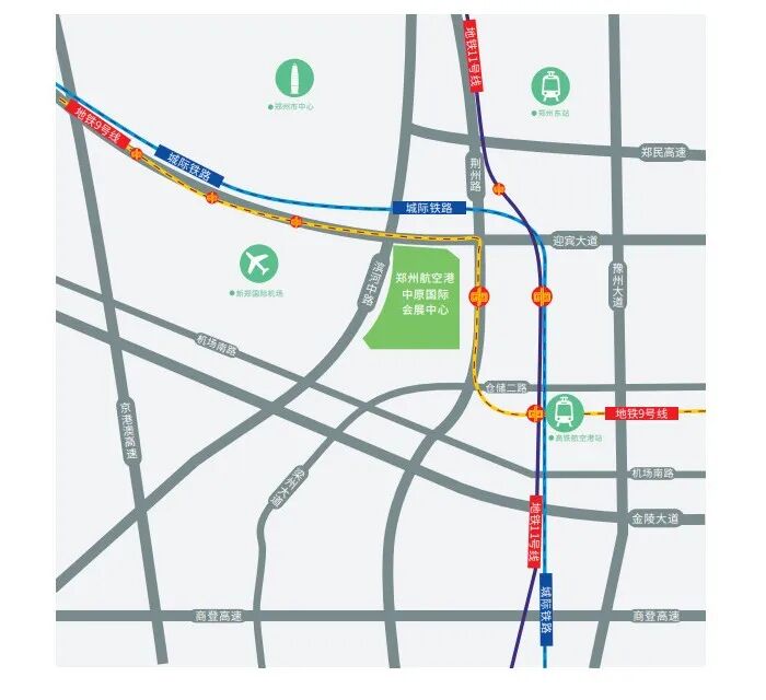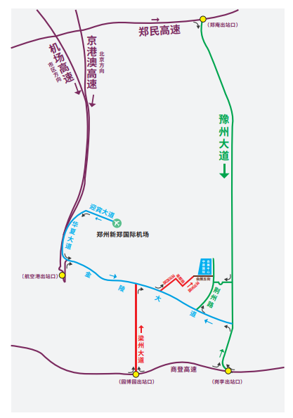 路线:从新郑机场出发→迎宾大道→华夏大道→金陵大道→滨河西路→亳都路→滨河东路→会展五路→中原国际会展中心