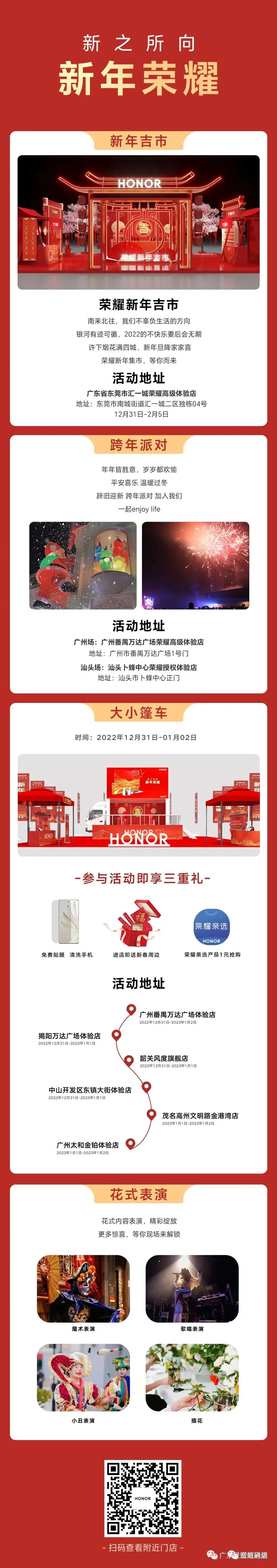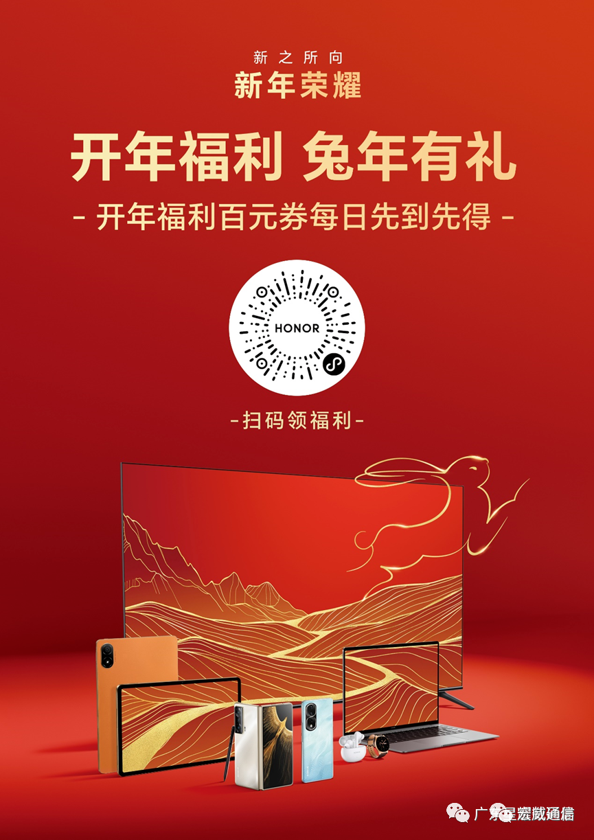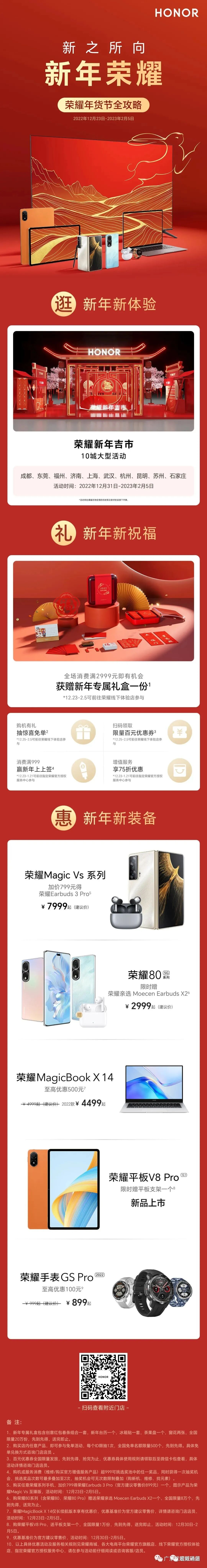 目前,荣耀2023年货节已经启动,在广东的荣耀门店都可以参与新年活动、享受新年优惠,欢迎消费者到店来逛新年吉市、享新春好礼;线上渠道也同样有机会领取福利。新年新气象,荣耀此次开展特别活动,希望为用户带来节日气氛和产品优惠叠加的双倍快乐,陪伴大家度过欢乐吉祥的新年,祝福每个热爱生活的人新年荣耀!