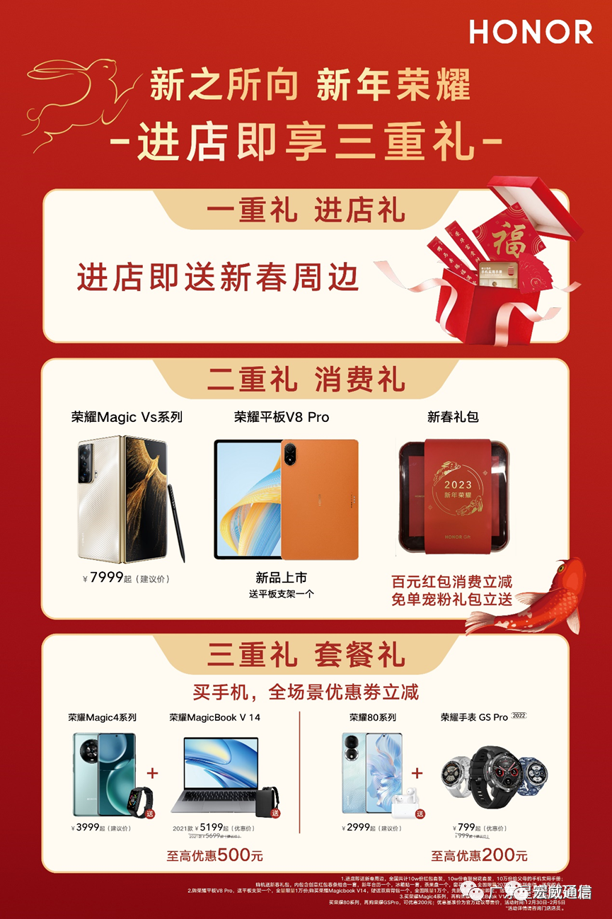 荣耀2023年货节,也同样会从互动体验趣味性、产品选购实惠性两个方面入手,带来一次别开生面的新年特别活动。广东荣耀也诚意满满,进店即享三重礼!
