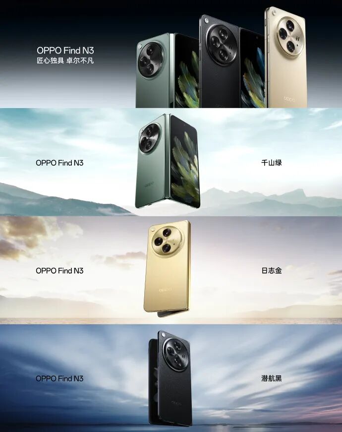 本次 Find N3 带来 3 款全新配色:千山绿、日志金与潜航黑。