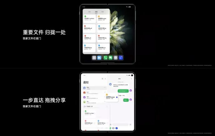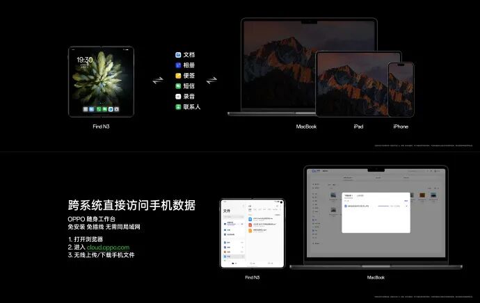 「开启移动新商务时代」文件随心开:支持超过 40 种文件类型,Keynote、Numbers、CAD 等专业文件直接打开,实现文件生态破壁。随身工作台:无论是 Mac 还是 iPad 等产品,均可快速简单地和 OPPO 手机进行文件互传与管理,打破系统和设备壁垒。文件任意门:重要文件归拢一处,一键拖拽分享,方便快捷。超视野全景虚拟屏:突破屏幕物理边界,让大屏分屏从「两个半屏」到「三个全屏」,真正让屏幕有边,内容无界。#OPPO Find N3#引领移动效率新革命,开启新商务时代!![]()