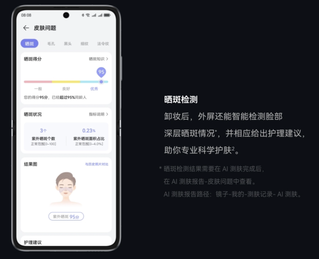 搭载第二代超光谱摄像头,配合手机领域首个超光谱AI融合感知算法,可以更精准地检测出紫外线的强度,并且能够识别出用户防晒霜的涂抹/卸除情况,助力用户精准防晒与无死角卸妆,护肤更加事半功倍。