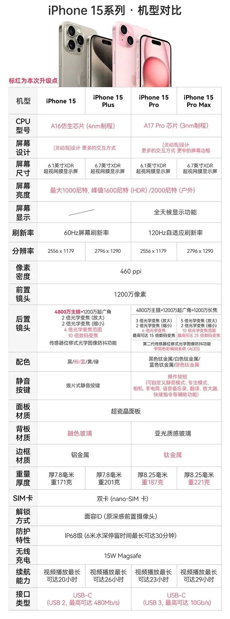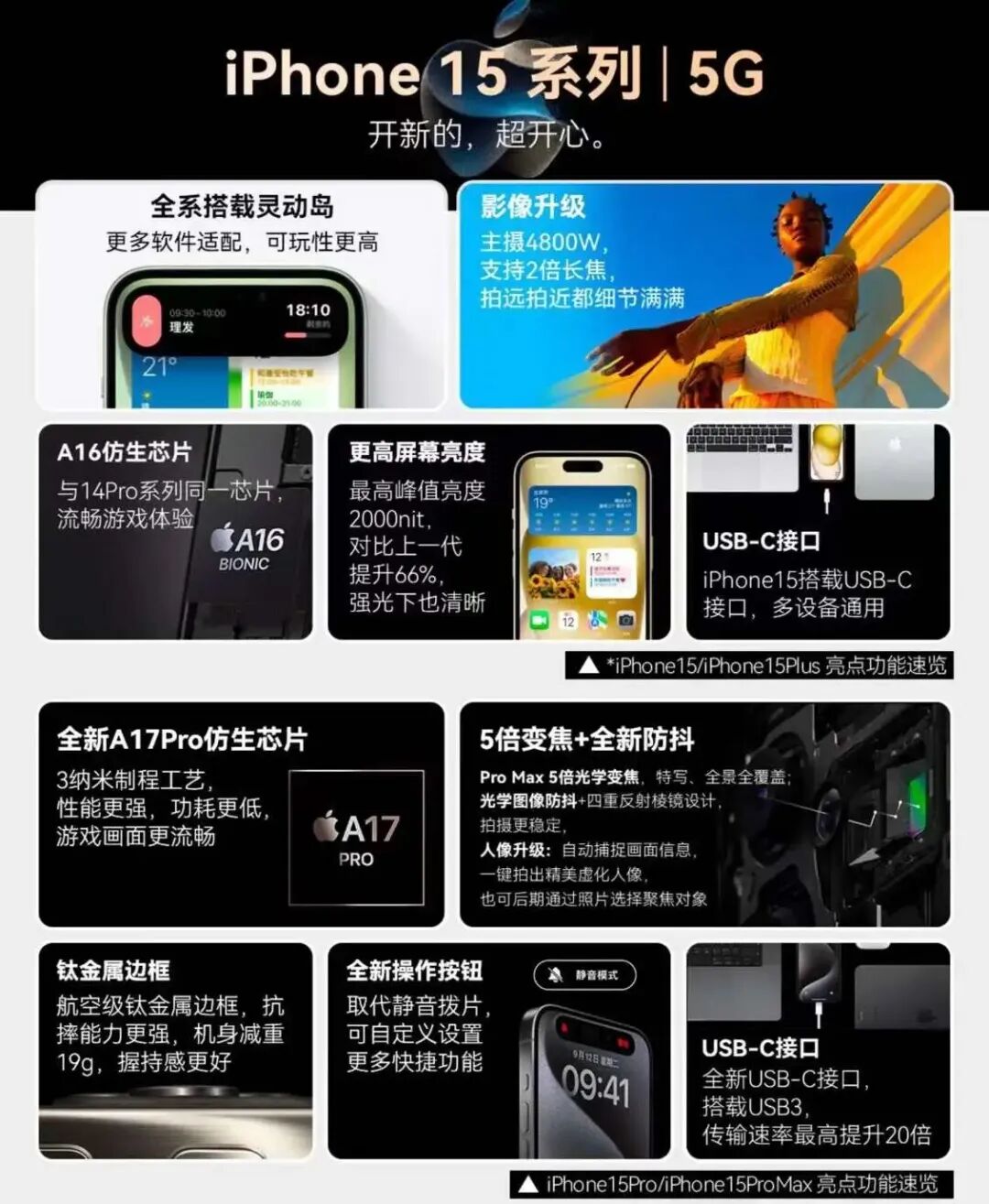 iPhone15全系升级灵动岛,中框均采用弧形边缘设计,升级USB-C接口,支持第二代超宽频,可以实现更精准的查找,支持通话时语音增强。新增卫星道路救援,可以通过卫星搜索、发送短信(国内暂不支持),依旧是6.1英寸和6.7英寸组合,续航均有所提升。先来看iPhone15、iPhone15 Plus配置信息。有粉色、蓝色、黄色、绿色、黑色共五款配色,配备了OLED超视网膜 XDR 显示屏,HDR 峰值亮度为1600尼特,户外峰值亮度为2000尼特。![]()