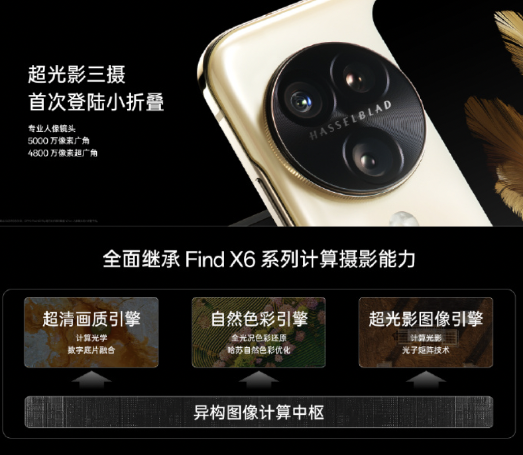 Find N3 Flip配备了专业人像镜头,全面继承了Find X6 系列的超清画质引擎、自然色彩引擎和超光影图像引擎。