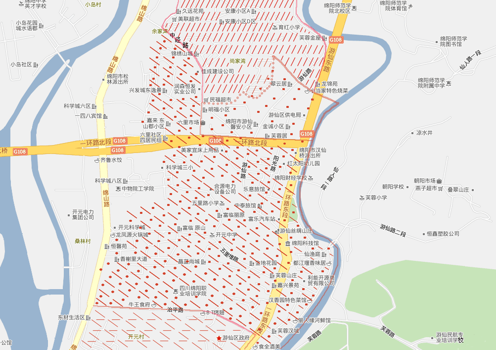 游仙街道游仙观社区、游仙东路社区、205省道与绵梓路交点以南的民安社区区域、金山村。