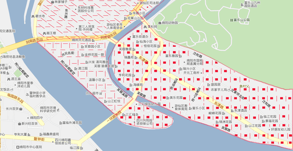 以涪江、富乐大桥、芙蓉溪、芙蓉桥为界,涪江以东、富乐大桥以北、芙蓉溪至芙蓉桥以西、一环路东段至治平路以西、治平路以南、绵山路沿线至治平路以东片区。