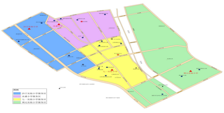 沙汀实小:好医生大道以西、银河大道以北的城区部分、西岩社区、前进社区、罗林社区(原罗林村)、雍峙村。