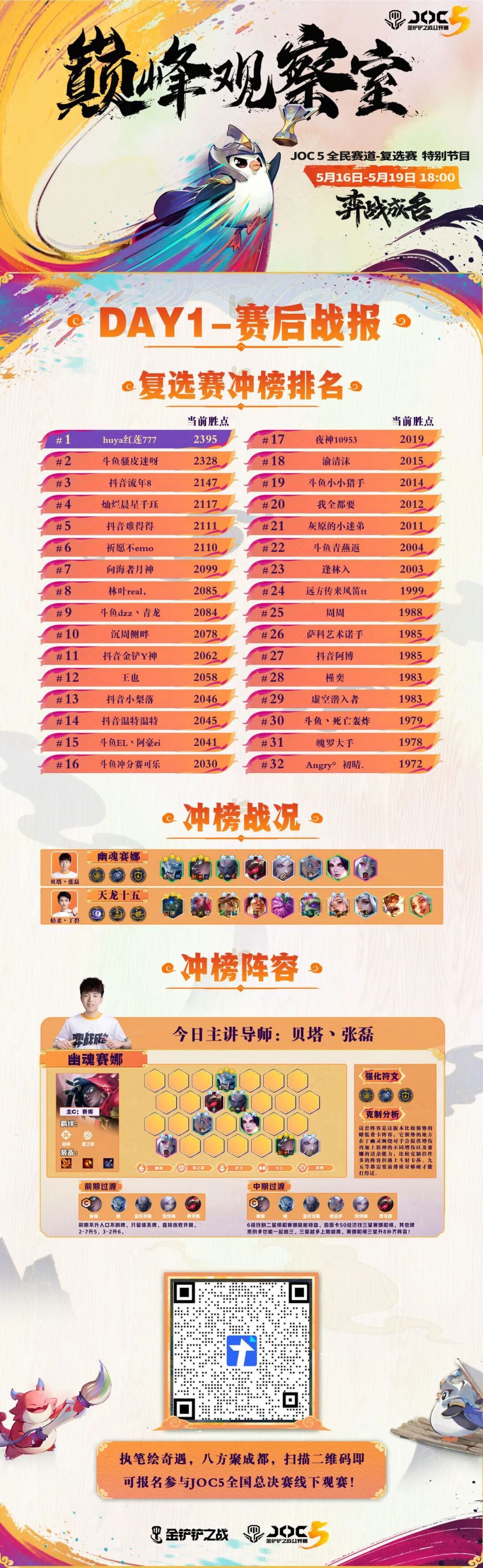 5月17日晚18点,JOC5全民赛道复选赛特别节目《巅峰观察室》精彩继续,敬请关注金铲铲之战官方直播间,观看更多赛事精彩内容。