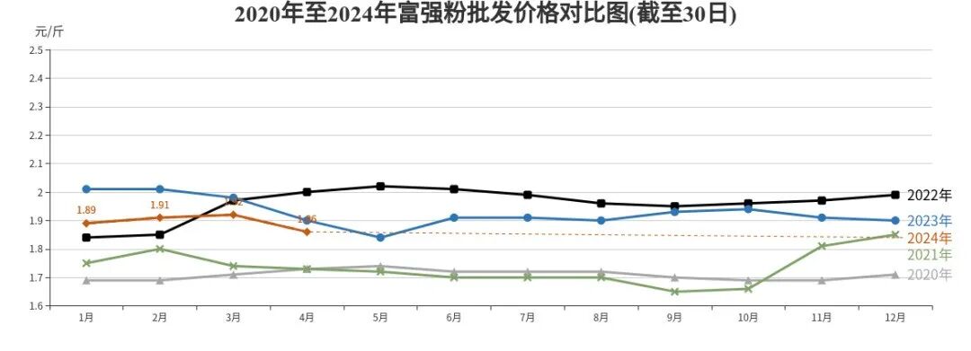 清明节过后,小麦价格开始止涨转跌,原粮价格下降,带动富强粉价格小幅回落。富强粉批发、农贸、超市价格分别为每斤1.86元、2.34元、2.41元,环比分别下降3.13%、持平、下降0.82%,同比分别下降2.11%、2.09%、1.23%。