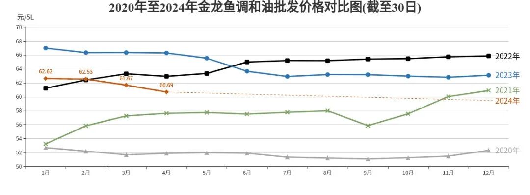 “金龙鱼”调和油批发、农贸、超市价格分别为每桶60.69元、68.16元、76元,环比分别下降1.59%、上涨0.26%、下降0.14%,同比分别下降8.42%、1.67%、3.33%。