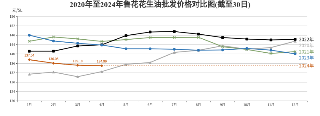 “鲁花”花生油批发、农贸、超市价格分别为每桶(5L,下同)134.99元、150.64元、157.14元,环比分别下降0.14%、0.52%、0.15%,同比分别下降6.11%、0.67%、1.97%。