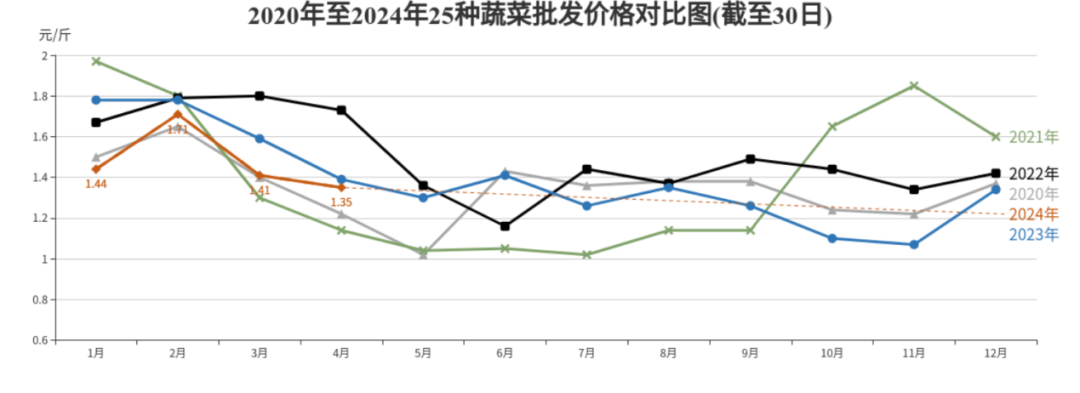 从蔬菜价格运行规律来看,4月供京蔬菜产地继续北移至河北周边地区,运输、保鲜及生产成本降低,整体价格保持规律性回落趋势。