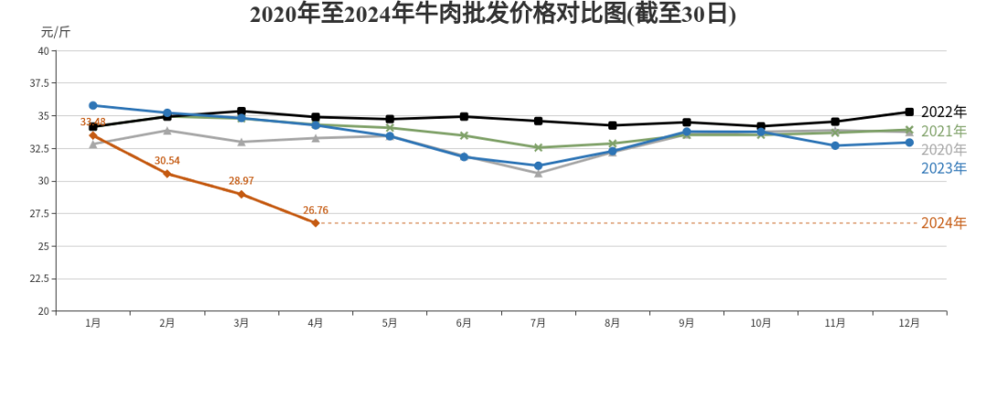 牛肉批发、农贸、超市价格分别为每斤26.76元、35.74元、40.78元,环比分别下降7.63%、1.95%、1.57%,同比分别下降21.89%、6.68%、10.61%。