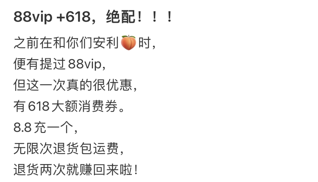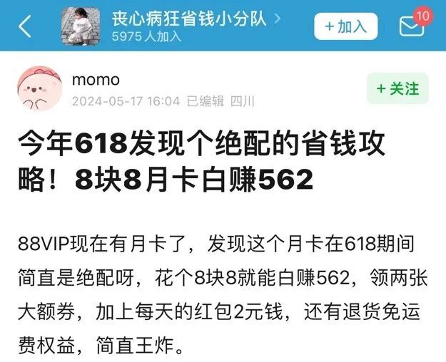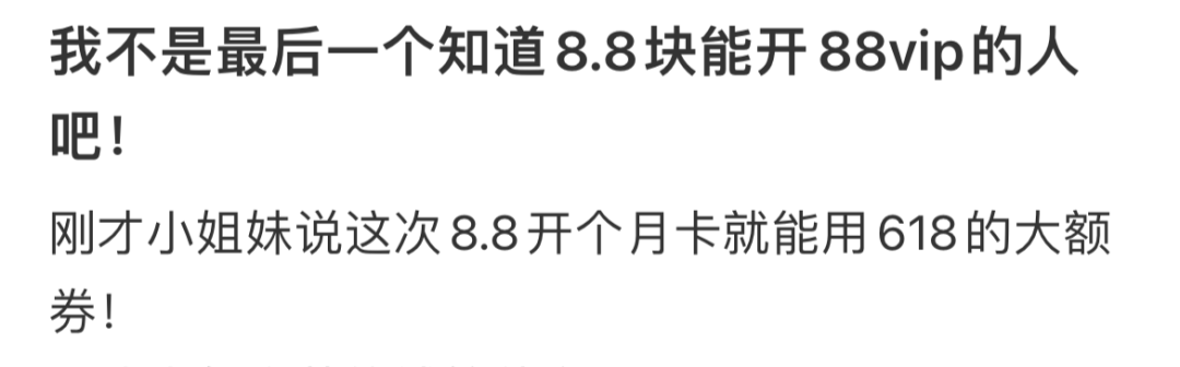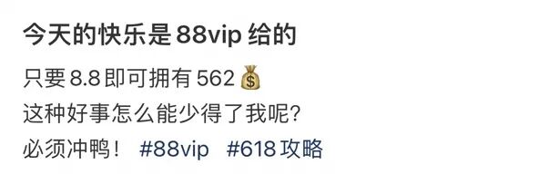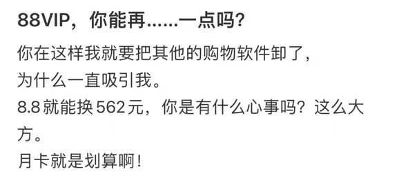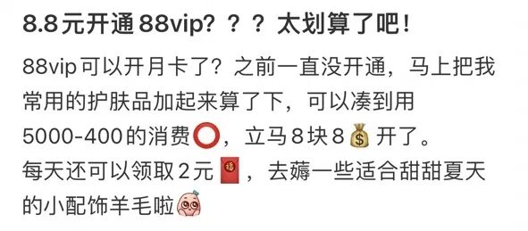 提醒一下还没领券的,刚刚拨号上网小伙伴们,打开淘宝,搜索“88VIP”进入会员中心,使用188积分即可兑换。但如果只有这些福利,并不值得我们今天专门发一篇文章广而告之。对于还不是88VIP(却对500块大额券感到眼红)的小伙伴们,今天也有个重大利好——首月只要花8块8就能开通,一开通就能领取天猫618首批500元大额券,并享受无限次退货免运费等权益。此前,消费者可是要花88元,开通年卡才可享受这一权益。消息一出,数学好的姐妹立刻就开始算账,并得出结论:加上无限次退货包运费,退货两次就赚回来了(并没有鼓励你们退货的意思!)有的姐妹算得更精细了,加上88VIP每天2元的红包,从本淘身上还能再薅62元。没错,只要8块8,就能硬薅562元实打实的羊毛。姐妹们纷纷表示:今日份的快乐是88VIP给的!个别激进的姐妹甚至热情地表示:要把其他购物软件卸了(我信你个鬼)。在此还是要郑重声明一下:本淘没有心事,本淘向来大方!这么好的薅羊毛利器,一天不到就在剁手姐妹圈子里光速普及,生恐做不到人手一份。