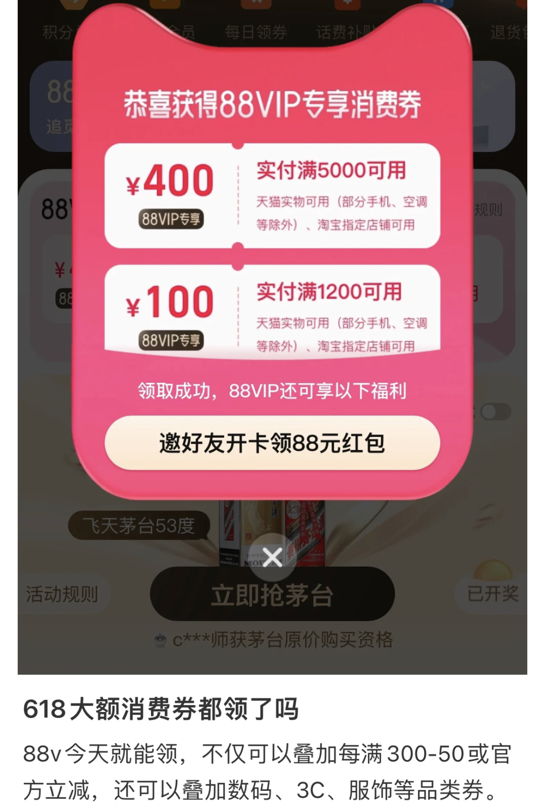 正所谓,工欲善其事必先利其器,今年618的薅羊毛利器,本淘也已经给大家准备好了。昨天晚上8点,大家关心的88VIP大额券已经开始发放了。一共两张,分别是“满5000-400”和“满1200-100”。今天看到很多小伙伴已经纷纷晒图,表示领到了领到了。甚至有些姐妹们是在买鸡蛋的时候被安利的。此处感谢一下这颗善良的蛋。![]()