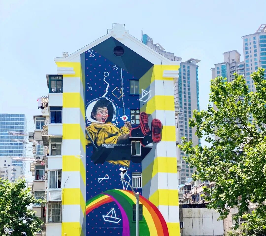 合庆郊野公园是本次路线中的第二打卡点,立邦在此设置了补给站为暴走队员们提供爱心午餐,满足队员们的“能量需求”。此外,在金杨陆悦坊附近和浦东南路潍坊街道周边分别有《小小宇航员》和《Swing to Future》两幅“为爱上色”ART+墙绘合影点,以绚丽的色彩和巧妙的构图吸引了不少队伍打卡留念。画面上,孩子们或凝视深邃的星空,或沉浸在无忧无虑的嬉戏之中,每一幅都承载着艺术家们对孩子们快乐成长的美好祝愿。这些作品不仅丰富了城市的文化景观,更为城市文明建设增添了一抹鲜明而温暖的色彩。