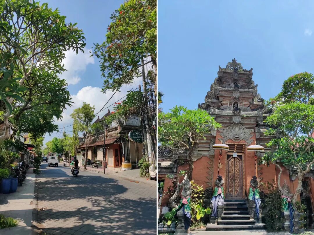 乌布地处内陆,位于巴厘岛中部,不靠海,有大片森林、梯田、椰林、瀑布、水景、皇宫、寺庙还有各式各样印尼风格的园林景观,充满了郁郁葱葱的热带植物,树木叶子绿油油,花是饱和度很高的颜色。虽然是城市,但觉得走在森林里,无时无刻不呼吸充足的氧气。