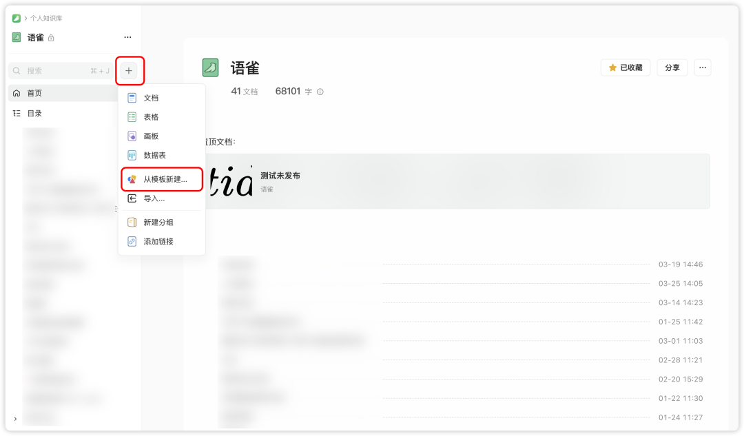 ❶ 打开你的旅行知识库,点击右上角 + ,选择「从模板添加」