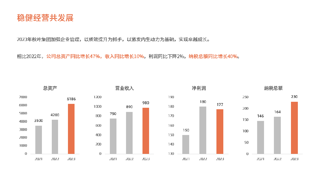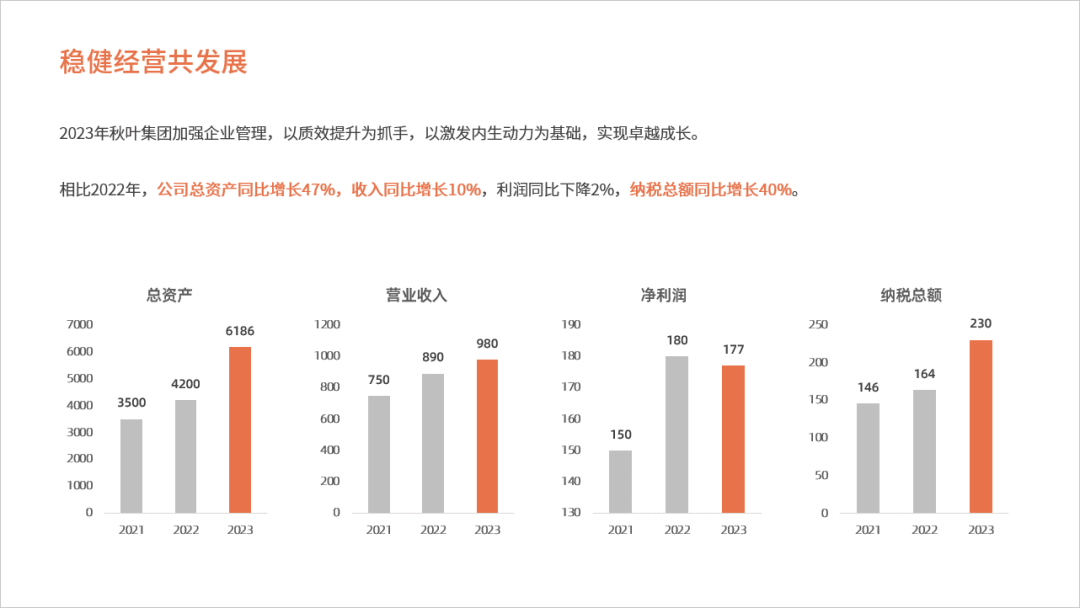 如果我们想要突出 2023 年的公司运营情况,可以将前两年的柱形图填充为灰色,2023 年的填充为主题色: